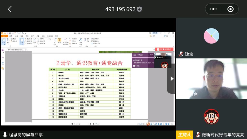 5月9-11日,yl7703永利集团邀请北京市优秀辅导员、清华大学学生部思想教育办公室主任程思亮通过腾讯会议,线上分享新雅书院办学经验。yl7703永利集团领导班子及工作人员参加学习交流。