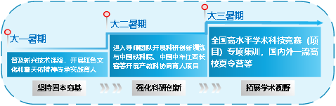 利用暑期小学期制的集中时间,厚植家国情怀,赓续红色基因,探知新兴技术,提升科研能力,拓展学术视野。遵循不同年级阶段学生的成才规律,逐级递进开展综合素质拓展训练(图2)。如大一普及人工智能等“0学分”的新兴学科知识,开展井冈山红色文化基因传承和詹天佑故居寻访等实践育人项目;大二集中开展科研创新训练以及与中国铁道科学研究院等科教协同育人项目;大三开展高水平科研竞赛专项集训以及国内外一流高校的夏令营等学术交流。