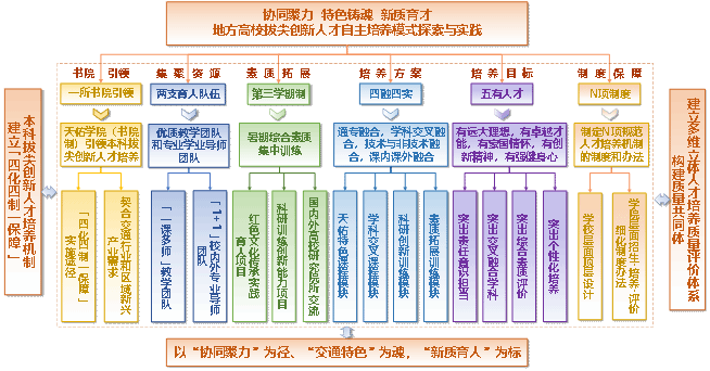 经过5年多的实践与检验,形成了“12345+N”(一所书院、两支队伍、三小学制、四融四实、五有人才、N项制度)的协同聚力、特色铸魂、新质育才的地方高校本科拔尖创新人才培养模式(图1),取得了突出成效。相关办学的条件、过程性活动和工作等资料,可在本网站的学院简介、学院动态、培养动态、学在天佑、教学督导团、党建思政、人才培养、师资队伍、导师风采、学生工作、永利集团、教学管理、科研训练等栏目中查询。