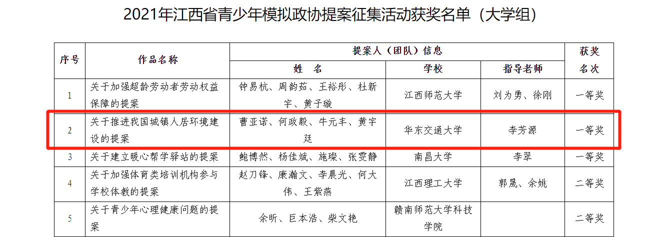 共青团江西省委、政协江西省委员会提案委员会、江西省学生联合会共同开展了2021年江西省青少年模拟政协提案征集活动。我院的《关于推进我国城镇人居环境建设》提案荣获大学组一等奖,是全校唯一一个一等奖。