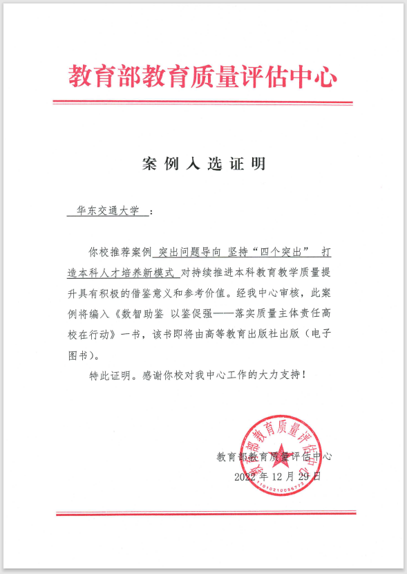 近日,教育部教育质量评估中心公布了全国普通高校本科教育教学质量报告应用案例评选结果,我院报送的《突出问题导向 坚持“四个突出” 打造本科人才培养新模式》成功入选。