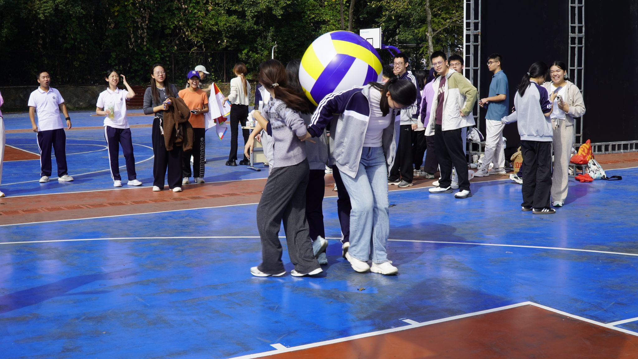 在井字棋接力赛中,选手们既要比拼往返冲刺的速度,又要在紧张节奏中保持冷静思考,完成棋盘对弈,速度与智慧的碰撞让现场掌声不断;螃蟹背西瓜项目里,参赛队员两两配合,小心翼翼地运送 “西瓜”,“慢点走”“稳住” 的提醒声与此起彼伏的尖叫声交织,欢乐氛围十足;五人六足比赛中,各队队员齐声喊着口号,步伐整齐划一、奋力向前,充分展现了团队协作的默契与力量;超级大排球项目凭借灵活的场地设置和超大球体,让运动小白与球场老手同台竞技,人人都能找到属于自己的快乐;篮球接力赛中,选手们既要完成快速接力,又要展现投篮功底,篮球划过的优美弧线与现场观众的欢呼声相映成趣;超级大旋风项目中,在学院党委书记俞店生的带领下,队员们左转右转、加速急停,时而小步慢移,时而大步流星,展现了出色的身体控制能力与团结协作精神;作为压轴项目的拔河比赛,更是将现场气氛推向高潮,参赛队员紧握绳索、身体后倾,“加油” 声与 “一二” 号子声震耳欲聋,在力量的对抗中凝聚起集体的向心力。