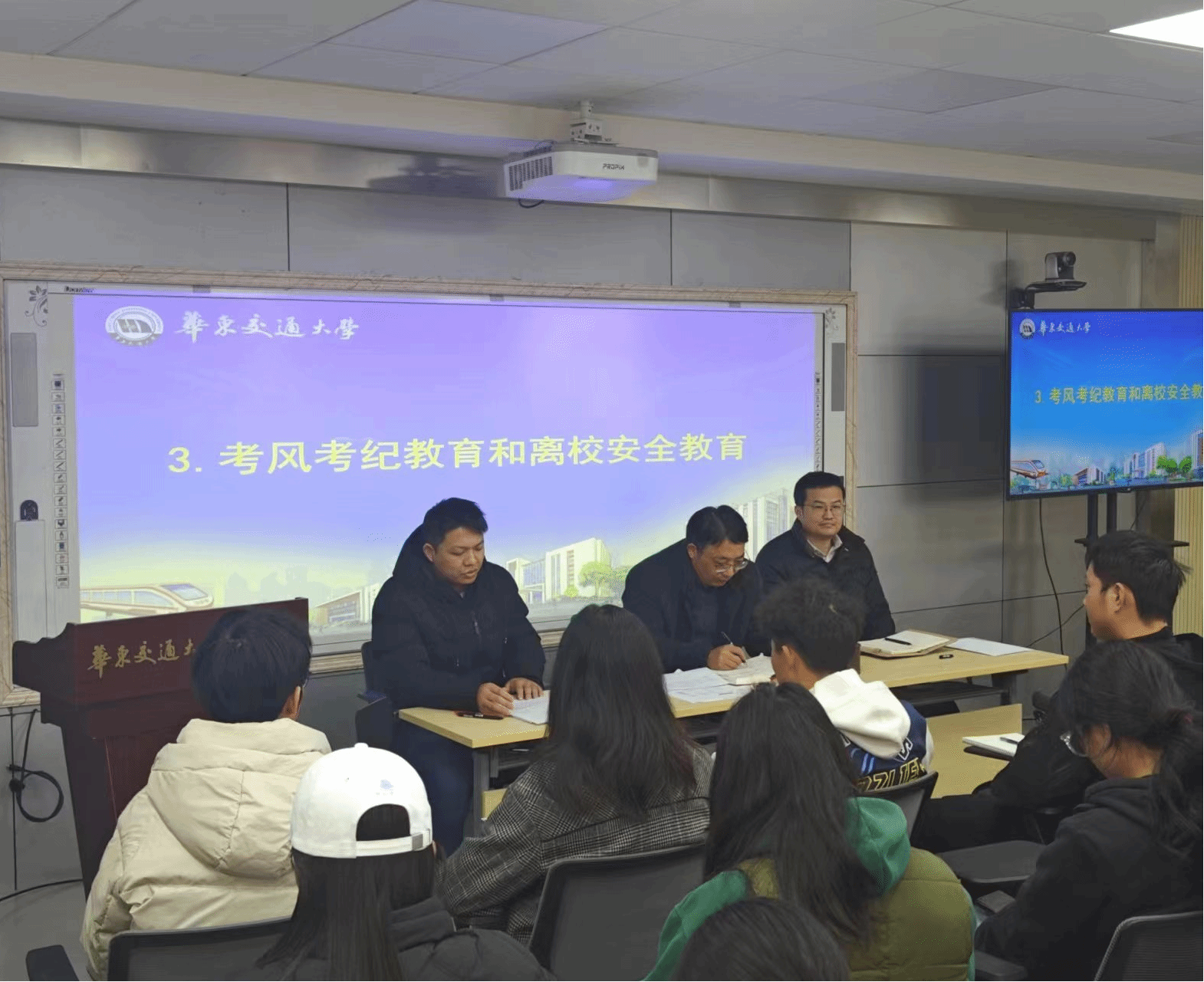 会议的第三项议程是由学院专职辅导员肖泽伟老师进行考风考纪教育和寒假离校安全教育,他说明了严肃考风考纪的重要性和寒假期间离校的注意事项。