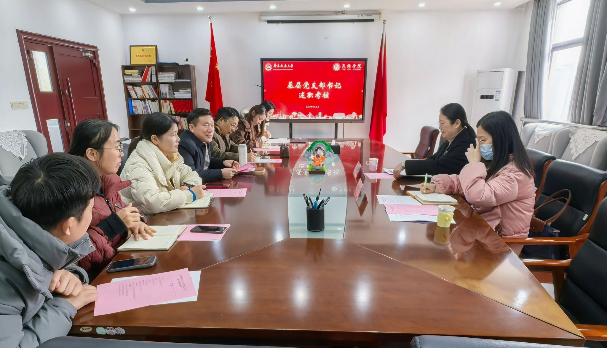 听取述职后,院党委书记俞店生进行逐一点评。他对两位支部书记一年来的辛勤付出与取得的工作成绩表示认可与感谢,并结合现场述职情况及日常观察,在肯定各支部特色亮点的基础上,精准指出了存在的具体问题。针对未来工作,俞店生提出明确要求:一要持续擦亮支部品牌,进一步鲜明支部工作特色,提升党建工作的辨识度和影响力;二要聚焦发挥党员先锋模范作用,积极探索有效载体,特别是要将“天佑导学”等品牌项目持续做深做实,积极向全校师生推广,服务更多学生成长成才;三要强化纪律作风建设,严格党员教育管理,注重工作过程的规范性和材料归档的严谨性,不断提升党建工作规范化、科学化水平。